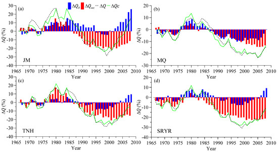 Because of the very low population density (2003 census data [15]) and a slight land-use change [22] in the SRYR, human activities were not directly accounted for in this study, but the impact of land-use change on discharge could then be approximately evaluated by ΔQl = ΔQ − ΔQc (Figure 3b).