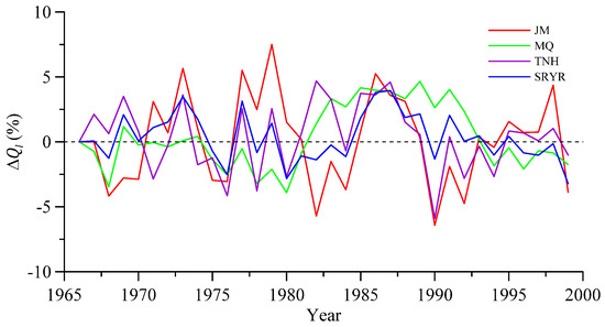 The change in discharge derived from land-use changes was then estimated by ΔQl = ΔQ − ΔQc from the new results of ΔQc. As shown in Figure 7, the ΔQl values were generally less than 5% of the total change and appeared to show a random oscillation, which indicates that the land-use-change impacts on discharge were negligible.