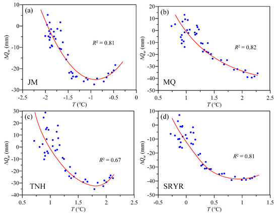 The temperature effect on the discharge change should be carefully considered when the freezing index (DDF) is used in analysis. Accordingly, we further analysed the relationship between the air temperature and ΔQw by nonlinear regression as shown in Figure 8. In the three sub-basins and the SRYR, the air temperature was significantly correlated with ΔQw, which was similar to the relationship between the DDF and ΔQw obtained by Wang [27]. However, ΔQw was not monotonically decreasing with increasing temperature, particularly in JM, TNH, and the SRYR. This indicates that using only temperature change could not sufficiently explain the change in ΔQw. In this study, we selected three climate factors (T, E0, and I) as candidate explanatory variables in the stepwise regression analysis and obtained four optimal models (Table 2). These optimal models explained the ΔQw change in the SRYR and the three sub-basins well (Figure 6). Because T and E0 were positive controls for the w value, they acted as negative controls for ΔQw. However, precipitation intensity (I) was a negative factor for w change and thus a positive factor for ΔQw change; hence the non-monotonic relationship between ΔQw and T was caused by increased precipitation.