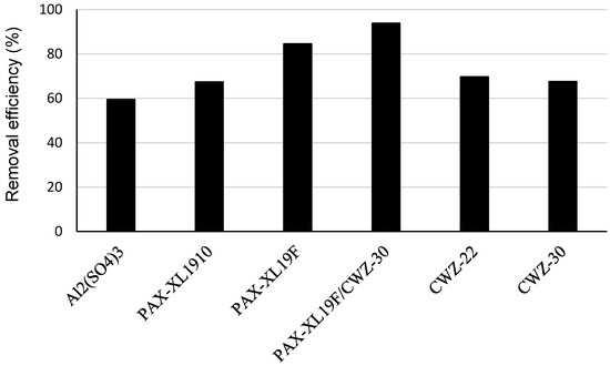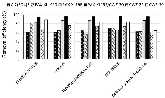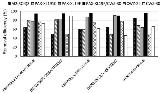 The highest efficiency of the reduction of the sum of four standardized PAH, i.e., benzo(b)fluoranthene, benzo(k)fluoranthene, benzo(g,h,i)perylene, indeno(1,2,3-cd)pyrene, was obtained in the case of PAX-XL19F coagulant application (by 84.5%). With the usage of the remaining coagulants, Al2(SO4)3 and PAX-XL1910, the efficiencies of reduction of total concentration of these compounds were 59.4% and 67.4%, respectively. The usage of powdered activated carbons CWZ-22 and CWZ-30 allowed a reduction in the sum of four PAH by 69.7% and 67.6%, respectively (Figure 2).