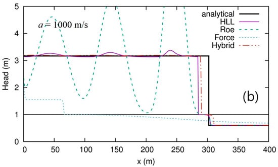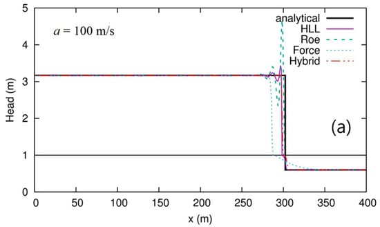 The Courant–Friedrichs–Lewy (CFL) number is set to 0.5 and two acoustic-wave velocities () are considered to estimate the performance of numerical schemes with relatively low and high values of wave velocity. The number of numerical cells is 400, as used in the study of Malekpour and Karney []. The values at intermediate region for HLL scheme are estimated by Equation (15) for all test problems in this paper.