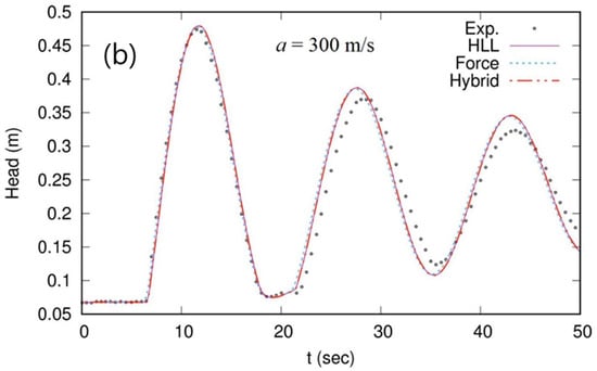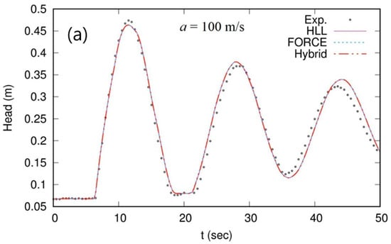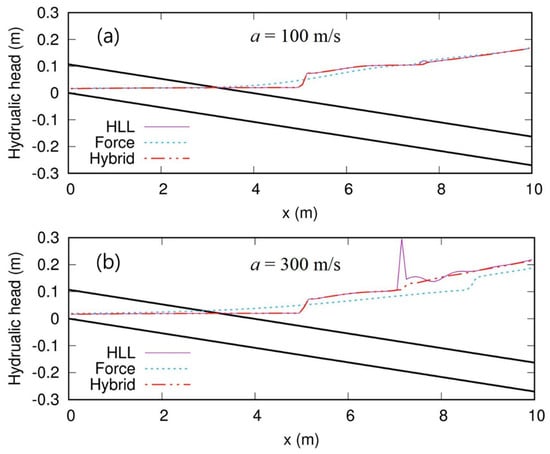 Figure 5 shows the observed and simulated pressure head 4.6 and 0.6 m upstream from the downstream sluice gate. The results of the HLL and hybrid schemes match well with the observed data overall whereas the FORCE scheme does not reproduce the observed pressure heads, even with a relatively low acoustic-wave speed . We hypothesize that the FORCE scheme is too diffusive to capture a filling bore propagation to a satisfactory level for this problem. The effect of the diffusive numerical flux is more significant when high acoustic-wave speed is adopted, which is also shown in Test 1. Figure 6 shows the hydraulic-head profile at 30 s. The HLL and hybrid scheme produce very similar profiles with . However, the HLL scheme causes significant spurious oscillations with at x = 7.5 m, whereas the hybrid scheme does not. For both cases, the FORCE scheme produces diffusive filling bore profiles. Although the acoustic-wave speed of 1000 m/s is also tested, the results are not presented here because all numerical schemes fail to simulate due to spurious oscillations. Note that the hybrid scheme proposed herein can, to a certain degree, alleviate the instability from spurious oscillations, but the very high acoustic-wave speed of over 1000 m/s still can cause numerical instability, depending on the situation.