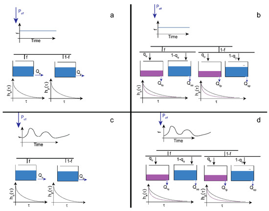 Assumptions in TRaSPAN model structures (a) constant fraction of effective precipitation (Peff) routed as event water and a single reservoir for the event and pre-event runoff components (structure 1); (b) constant fraction of Peff routed as event water and two reservoirs in parallel for the event and pre-event runoff components (structure 2); (c) time-variable fraction of Peff routed as event water and a single reservoir for the event and pre-event runoff components (structure 3); and (d) the time-variable fraction of Peff routed as event water and two reservoirs in parallel for the event and pre-event runoff components (structure 4).