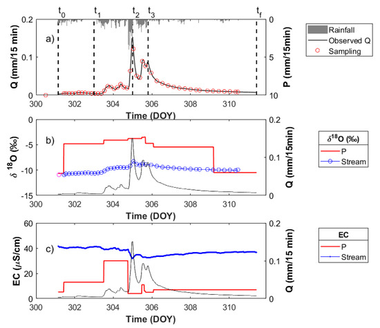 Temporal variability of the hydrometric and tracer data during the event monitored between 28 October and 7 November 2015 at Mack Creek. (a) Rainfall (P), runoff (Q), and sample collection times. Vertical dashed lines (t0 − tf) indicate periods described in Section 3.1; (b) δ18O in stream and P; and (c) electrical conductivity (EC) in stream and P.