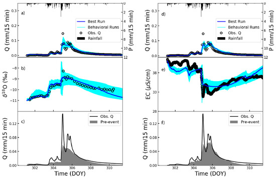 The simulation results using TRaSPAN model structure 4 (i.e., the time variant fraction of Peff routed as event water and two connected reservoirs for event and pre-event water; Figure 2d) showed that this structure better captured the temporal dynamics of Q using both tracers. All peaks (e.g., the highest peak produced on DOY 305) and the recession (DOY 306–311) of the hydrograph were well simulated by this model structure using δ18O (Figure 5a) and EC (Figure 5d). Similarly, the temporal dynamics of the tracers’ signal were well simulated by this model structure. Even though this model structure underestimated the δ18OQ enrichment (Figure 5b) and overestimated the decrease in ECQ (Figure 5e) on DOY 304; the most enriched δ18OQ and the lowest ECQ peak values (DOY 305), as well as the rest of the tracer dynamics, fitted the observed data well. The estimated proportions of pre-event water were 74.9% using δ18O and 81% using EC (Table 3). The temporal variability of the pre-event water contributions were similar using δ18O (Figure 5c) and EC (Figure 5f) and showed a dominance of pre-event water contributions, even during the peak Q generation.