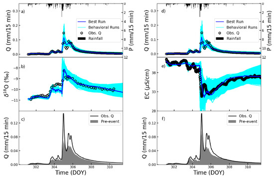 TraSPAN model results of the hydrograph separation using structure 4 calibrated with δ18O (a–c) and electrical conductivity (EC) (d–f) as tracers. (a, b, d, and e) present observed (open markers) and simulated streamflow and tracer data according to all parameter sets (blue lines) that yield a Nash-Sutcliffe coefficient above 0.75 (behavioral parameter sets). The best simulated times series in both cases are depicted in dark blue lines. (c and f) present the pre-event water (gray area) and the event water (white area) contributions during the storm, according to the best set of parameters.