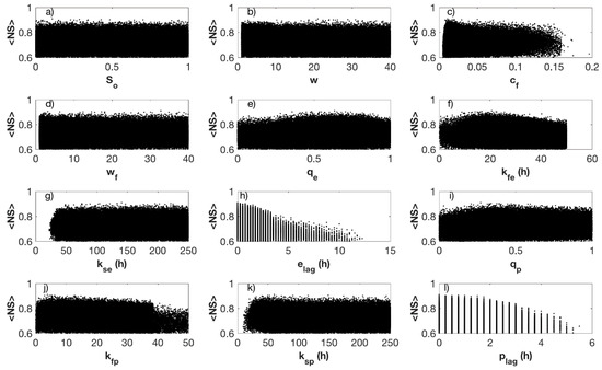 According to the dotty plots (i.e., values of the NSE as a function of the calibrated parameters for a given model run), seven of the 12 parameters of model structure 4 using EC for calibration reached a single peak in the parameter space yielding the highest NSE (Figure 6). These parameters were: the normalization constant (cf = 0.01; Figure 6c; Table 2) of module 2 and the fraction of water routed into the fast-responding reservoir of event water (qe = 0.63; Figure 6e), the mean transit time (MTT) of the fast fraction of event water (kfe = 20.62 h; Figure 6f), the time delay for the event fraction response (elag = 0 h; Figure 6h), the fraction of water routed into the fast-responding reservoir of pre-event water (qp = 0.27; Figure 6i), and the MTT of the fast fraction of pre-event water (kfp = 3.84 h; Figure 6j), and the time delay for the pre-event fraction response (plag = 0 h; Figure 6l) of module 3. Both parameters of module 1 (So; Figure 6a and w; Figure 6b), the memory timescale parameter (wf) of module 2 (Figure 6d), and the slow fractions of event (kse; Figure 6g) and pre-event (ksp; Figure 6k) water of module 3 showed equifinality [79]. That is, these parameters did not reach a single peak associated to the highest NSE in their parameter space distributions. The distributions of the model parameters for model structure 4 calibrated using δ18O was similar (Figure S9) and the ranges of calibrated parameters using both tracers were in strong agreement (Figure 7).