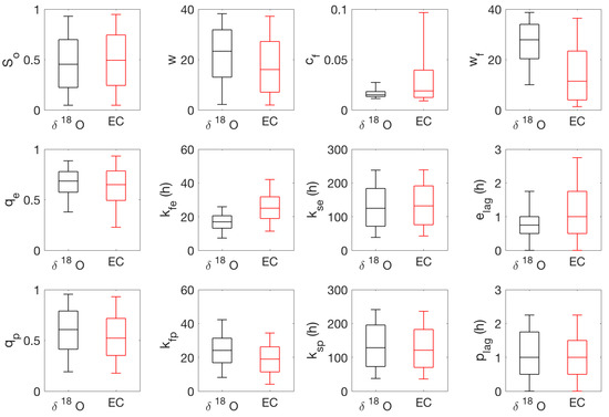 Box plots of the calibrated parameters considering sets that yielded NSE > 0.75 from the last run (i.e., 1 × 107 simulations) using model structure 4 calibrated for δ18O and electrical conductivity (EC) data. Parameter names are shown in Table 1.