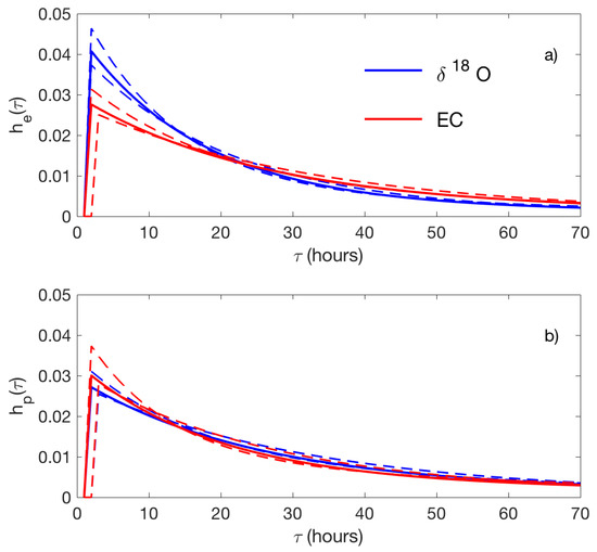 Transit time distributions (TTDs) of the (a) event (he) and (b) pre-event (hp) flow components for model structure 4 using δ18O and electrical conductivity (EC) for calibration. The solid lines represent TTDs based on the 50th percentiles of behavioral (>0.75 NSE) parameter sets. The dashed lines correspond to the TTD defined based on parameter sets representing the 25th and 75th percentiles of their distributions.