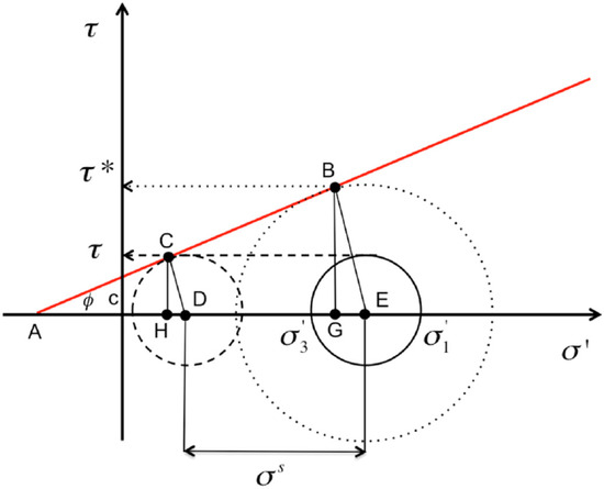 The local factor of safety method [42] was used in this study to estimate slope stability. This method is based on the Mohr-Coulomb failure criterion (Figure 1). It defines the local factor of safety (LFS) as the ratio of the potential Coulomb stress to the current Coulomb stress, shown in Equation (7). In this theory, the solid Mohr circle is assumed to be the current state of stress of a soil element. When the water content of the soil is increased, the solid Mohr circle shifts leftward because of the suction stress increasing. The size of the Mohr circle remains nearly unchanged because it is related to the difference in the principal total stresses , which are determined by the slope geometry and the self-weight of the soil. If the Mohr circle shifting leftward, the Mohr circle is closer to the Mohr-Coulomb failure envelope, then, the state of stress of the soil is closer to the failure condition.