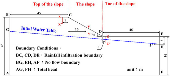 The finite element software HYDRUS 2D [43] and the Slope Cube Module [49] were used to establish a coupled hydromechanical framework to investigate the effect of rainfall infiltration on slope stability. The geometry and boundary conditions of the two-dimensional (2D) slope model are shown in Figure 2. The boundaries of the slope surface (BC, CD and DE boundaries) were set as the rainfall infiltration boundaries and the sides of the slope (AG and FH boundaries) were set as the boundaries of the fixed water level to maintain the depth of the original groundwater level in the slope. BG, EH and AF were the no-flow boundaries; the flux at these three boundaries is zero.
