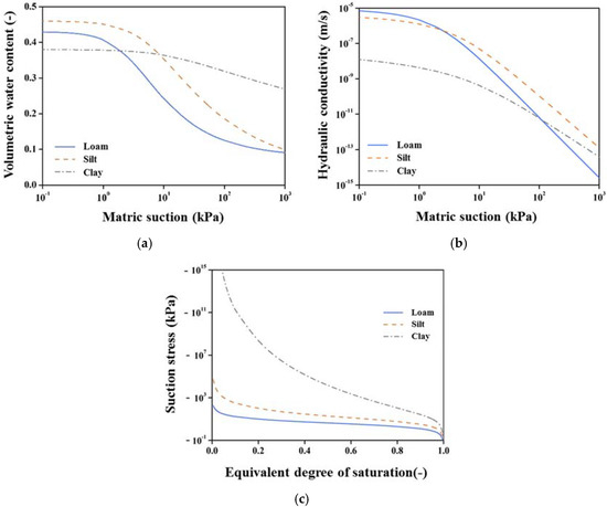 In this study, three types of soil were considered, namely loam, silt and clay, representing high to low hydraulic conductivity residual soils. The hydraulic properties of the materials include saturated water content (), saturated hydraulic conductivity () and the fitting parameters and n for SWRC [44], as shown in Table 1. From the theories of SWRC, HCF and suction stress mentioned above, the corresponding pore water pressure, soil water permeability and soil suction stress of the slope materials can be obtained for various water content conditions (Figure 3). Table 2 shows the compiled mechanical characteristic parameters of the soils, where Gs represents the specific weight of the soil, E represents the Young’s modulus of the soil and v is Poisson’s ratio.