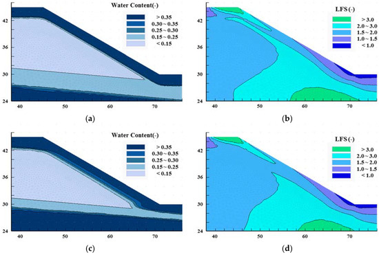 Effect of soil hydraulic conductivity anisotropy on soil water content and local factor of safety (LFS) distribution (using results for loam slope as an example). (a) Kr = 1 (water content); (b) Kr = 1 (LFS); (c) Kr = 100 (water content); (d) Kr = 100 (LFS).