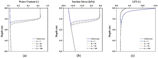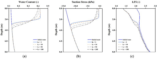 The results of water content, soil suction stress and LFS at the top of the slope (X-X’ section) after a rainfall event in different cases are first discussed. The results for the loam slope show that the thickness of the wetting zone caused by rainfall infiltration increases by about 12.5% when Kr is increased from 1 to 100 (Figure 5). When Kr is increased and Ky remains constant, the soil permeability in the horizontal direction increases. The rainfall in the soil tends to infiltrate in the horizontal direction and thus the rainwater permeates deep into the slope. The soil at the top of the slope is also affected by this phenomenon. The soil water content at depths in the range of 2.8 to 3.2 m is increased in the high anisotropy case and the change of water content also affect soil suction stress and LFS, as shown in Figure 5b,c.