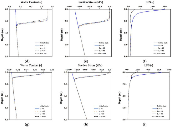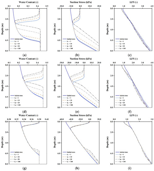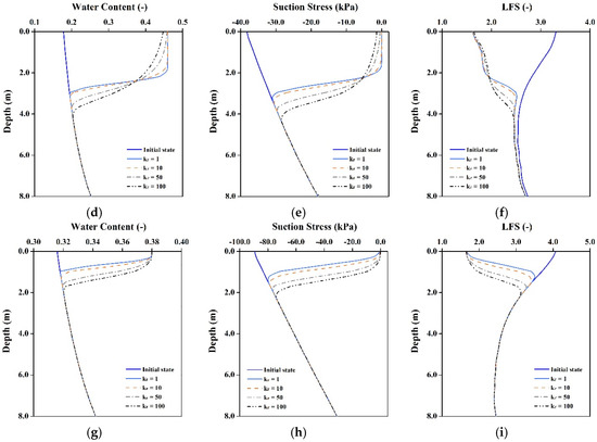Results of rainfall infiltration in various hydraulic conductivity anisotropy cases at top of slope (X-X’). Changes in (a,d,g) Water content; (b,e,h) Suction stress; and (c,f,i) LFS for loam, silt and clay slopes, respectively. (a) Loam; (b) Loam; (c) Loam; (d) Silt; (e) Silt; (f) Silt; (g) Clay; (h) Clay; (i) Clay.