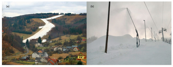 Figure 1. (a) The studied ski slope of the Košútka Ski Centre after the snowmelt of natural snow in the surroundings of the ski slope on 18 February 2016; (b) The beginning of the season started with an enormous production of snow (base layer snowmaking; 21 December 2016). Shown are snowmaking lances beside the ski lift at the orographic left side of the slope.