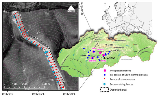 Snowfall and snow cover have a significant impact on different human activities and, therefore, on the entire society and environment. This impact is obvious mainly in mountainous regions of the world with an abundance of natural snow [1]. In Central Europe (above 500 m a.s.l., but mainly above 1000 m a.s.l.), such regions are, particularly, the Alpine and Carpathian regions. In these parts of Europe, the amount of snow and the duration of snow cover are of great social and economic importance. The amount of snow mainly affects winter tourism and water supplies for hydroelectric power stations [2]. Winter tourism is one of the most important economic sectors of mountainous regions in the world [3]. However, winter tourism depends on good snow conditions and is very sensitive to the lack of snow [4]. The majority of climate change scenarios predict the shortening of the duration of seasonal snow cover [5]. Studies on precipitation variability show decreasing trends of precipitation totals in Central and Southern Europe [6,7,8]. In the context of climate change, areas with persistent snow cover shrink relatively quickly, and occasional snow cover with liquid precipitation in the middle of winter expands over the territory of Slovakia [9]. Vojtek et al. [10] and Škvarenina et al. [11] pointed out the general tendency of the decreasing duration of snow cover and solid precipitation occurrence at lower altitudes in Slovakia (Central Europe). Approximately, 55% of Slovakia has altitudes between 300 m a.s.l. and 1000 m a.s.l., but only 5.4% of its territory is higher than 1000 m a.s.l. [12]. Due to the low altitude of many Slovak ski areas, snow coverage is not always guaranteed [13]. The winter season at the study site (Košútka Ski Centre; 610 m a.s.l.; Inner Western Carpathians) usually lasts three months, from the end of December to the middle of March, because of heavy base layer snowmaking at the beginning of each season. Low-altitude valley runs in the Alps can also be reliably opened for three months only with the help of intensive snowmaking [14].