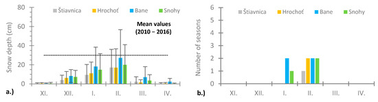 The depth of natural snow cover on grassland is considered to be sufficient for skiing (ski slope operation) when it is at least 30 cm [30]. In the six-season average, the mean monthly depth of natural snow cover in South-Central Slovakia was sufficient for ski slope operation for, maximally, two months (January, February; Figure 3b) in two of six seasons (Table 2). The probability that, in the winter season, a month with sufficient monthly average snow depth will occur varied from 17% to 33%. High standard deviations displayed in Figure 3a express high inter-seasonal variability of the monthly average snow depth, which was the highest at all precipitation stations (“station”) in February. The highest variability in February was detected at the Bane station, where the monthly average snow depth in February 2012 was 66 cm and in February 2014 was 1 cm. Seasons 2011–2012 and 2012–2013 were snow-rich because the monthly average snow depth in all precipitation stations was higher than 30 cm for at least one month (Table 2). Two month-long periods, when the monthly average snow depth was higher than the threshold of 30 cm, were detected at the Bane station in the 2011–2012 and 2012–2013 seasons and in the Snohy station in the 2011–2012 season. At all precipitation stations, the threshold of 30 cm (mean average snow depth) was not reached in four of six seasons, indicating that they were snow-poor (seasons 2010–2011, 2013–2014, 2014–2015, and 2015–2016) (see Table 2).