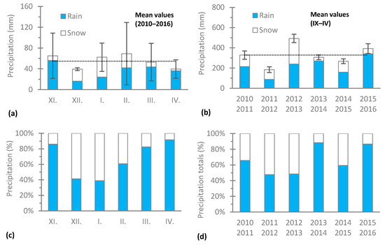 The highest seasonal precipitation totals were found in the 2012–2013, 2015–2016, and 2010–2011 seasons (more than 328 mm–value of six-season average; Figure 4b). In the 2012–2013 season, the highest volume of solid precipitation was identified (254 mm). Snow in the 2011–2012 (52%) and 2012–2013 (51%) seasons represented more than 50% of the seasonal precipitation totals (Figure 4d). On the contrary, solid precipitation during the 2013–2014 (12%) and 2015–2016 (13%) seasons represented the lowest percentage of the seasonal total.