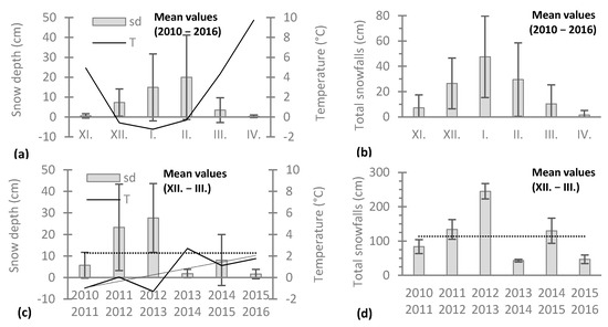 Figure 5. Mean (a,b) monthly and (c,d) seasonal values of the daily average snow depth (sd), daily average temperature (T), and total snowfall (sum of snowfalls). The horizontal dotted lines indicate the mean value from the displayed bar plot data. Bar plots are shown with SD.