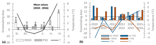 Figure 6. (a) The mean (±SD) number of potential snowmaking days (PSD) in contrast to the required number of snowmaking days (RND) and the monthly course of mean daily average temperature (T); (b) Seasonal values of PSD vs. RNSD and mean daily average temperatures in December and January. The horizontal dotted lines indicate the minimum number of five days for base layer snowmaking (20 cm thick).