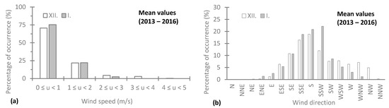 Wind speed and wind direction are not crucial meteorological conditions for snowmaking. Nevertheless, wind significantly affects the accumulation of artificial snow during its production. In three-season averages, during the potential snowmaking days in December and January, wind with a maximum speed of 1 m/s occurred 73% of the time, while it blew 65% of the time from the SW–SE side (Figure 7a,b). The mean difference in the wind speed categories between December and January was 14 h (2% of occurrence; Figure 7a). During the days with optimal snowmaking conditions (PSD) at the beginning of the winter season (XII–I), the wind speed was proper for the snow production most of the time. At the beginning of the winter season, at the study site, 94% of the time the wind was calm or blew only lightly with a maximum speed of 2 m/s from the SW–SE side (Figure 8).