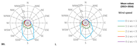 Figure 8. Three-season (2013–2016) average wind speed and direction in (XII) December and (I) January. The graph axis displays the average number of hours. The sum of the displayed hours is 676 in December and 667 in January. Wind roses were created from the mean hourly wind speed and direction data.