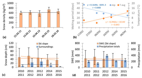 Figure 9. (a) Mean density of the residual snowpack on the artificially covered ski slope after the disappearance of natural snow in the surroundings (five seasons); (b) Relationship between the date in the season (five seasons displayed) when the natural snow cover on the off-piste sites was melted away and the melting period (mp) or temperature (T avg). The melting period expresses the prolonged duration of the melting of the snowpack on the artificially covered ski slope compared to off-piste sites. The temperature expresses the mean daily average temperature during the melting period; (c) Mean depth of snow on the artificially covered ski slope (at the end of winter season) in comparison to the mean seasonal depth (XII–III) of natural snow in the surroundings; (d) Mean snow water equivalent (SWE) of the ski slope snowpack (at the end of the winter season) in comparison to the seasonal precipitation totals (XII–III). The horizontal dashed lines indicate the mean value except for subfigure “b”. Mean values are displayed with standard deviation bars.