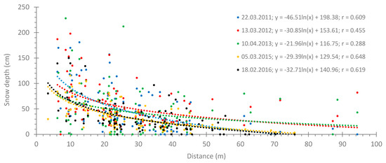 Figure 10. Relationships between the snow depth on the artificially covered ski slope and the closest distance from the snow-making lances at the end of the 2010−2011 to 2015−2016 seasons. The correlation coefficient “r” measures the strength of the logarithmic relationship. The points represent 96 measured values of the snow depth.