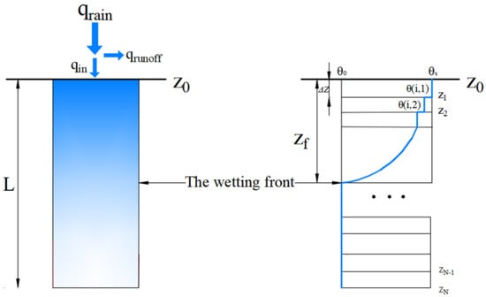 Infiltration refers to a kind of water flow under gravity and capillary forces through soils. It is of critical importance for the research of water flow processes in a broad range of hydrological fields, such as agriculture, irrigation, aquifer recharge, water environment management, etc. In the urban flood control field, it is important to understand the distribution of soil water content and predict surface runoff under unsteady rainfall [1,2,3,4].