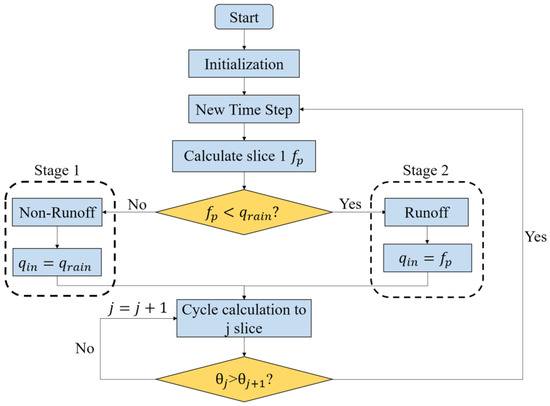 We simulated the infiltration process based on a linear analytical solution of the Richards equation. Under different rainfall and initial soil water content conditions, the calculation results show the spatial-temporal distribution of soil water content, the time of runoff, and the cumulative runoff. An automatic judgment of infiltration stages has already been taken to guarantee the preciseness of this computation method. A schematic illustration of the main calculation steps is shown in Figure 2.