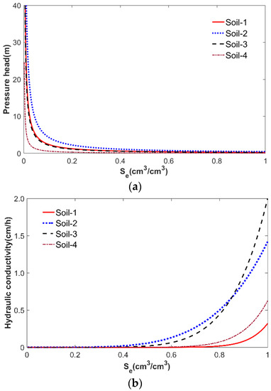 Soil–water characteristic curves of different soil types. (a) Pressure head curves; (b) Hydraulic conductivity curves.