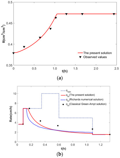Morbidelli et al. [45] and Essig et al. [43] created a homogeneous soil model with a depth of to observe the experimental phenomena of infiltration and deep flow in the laboratory. Soil-1 is selected in this experiment, and the corresponding hydraulic parameters are shown in Table 1. In addition, the initial soil water content distribution was obtained from Essig et al. [43]. Figure 4a shows the comparison between the present solution and laboratory experimental results under steady rainfall conditions (). From Figure 4a, the variation of soil water content for the present solution and observed values are similar at a depth of . In addition, the time of runoff for the present solution and observed values are 0.317 h and 0.33 h, respectively, and the relative error is 4.0%, indicating that the predictions of water content distribution and time of ponding in the present solution are credible.