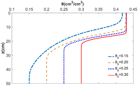 Figure 5 shows the distribution of soil water content after infiltration of 1 h with different initial soil water contents () under steady rainfall condition . Soil-3 was adopted in this case, and the hydraulic parameters are also shown in Table 1.