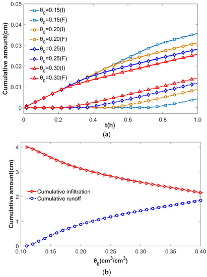 Cumulative infiltration and runoff versus time with different initial soil water contents. (a) Cumulative infiltration and cumulative runoff with different initial soil water contents; (b) Cumulative amount versus initial soil water contents at .