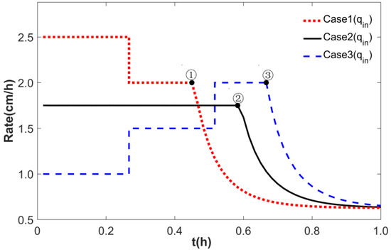 The significant way to control urban flood is a reduction of surface runoff. In this paper, the effect of rainfall conditions on surface runoff was analyzed. The soil sample is Soil-4, with the parameters from Table 1. The rainfall conditions in this paper are classified into rainfall decrease (Case 1), steady rainfall intensity (Case 2), and rainfall increase (Case 3), with the same average magnitude as shown in Figure 8. Figure 9 shows the variations of surface infiltration rate with time under three different rainfall conditions. From Figure 9, the time of runoff with Case 1, Case 2, and Case 3 are 0.450 h, 0.583 h, and 0.667 h, respectively. The runoff with rainfall decrease exists earliest, which is 22.8% and 48.2% earlier than that of Case 2 and Case 3, respectively. The results show that with large rainfall intensity at the initial stage, the surface soil water content increases rapidly, and the pressure head gradient decreases promptly. Correspondingly, the infiltration capacity of soils decreases fast, leading to the early existence of runoff.