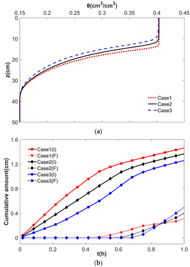 Figure 10a shows the distribution of the soil water content on profile after 1 h of infiltration under three different rainfall conditions. From Figure 10a, the depth of the wetting front under three cases of rainfall intensity were similar (). Furthermore, in same depth, the value of soil water content with decreasing rainfall intensity was greatest among the three cases, while the corresponding value with increasing rainfall intensity was smallest. For Case 1, with a large rainfall intensity at the initial stage, the soil water content increased more in the same depth, which indicates that its cumulative infiltration was largest among the three cases.