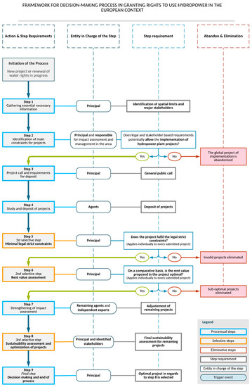 The Directive 2014/25/EU indirectly recognizes this issue and requires a competitive process to select energy projects and the integration of sustainable development goals in the decision process. With this article, we build a bridge between this European Directive and the attribution of water rights for hydropower production. We propose a generic framework for granting water rights that consists of nine steps, as illustrated in Figure 1.