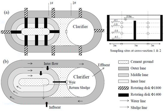 Scheme of an Orbal oxidation ditch and sampling sites. (a) Rotating disks on the oxidation ditch and the sampling sites at the cross-section; (b) Fluidic directions between the reactors.