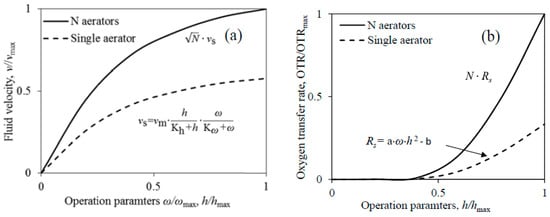 The concept of the multiple surface aerators. (a) Model of fluid velocity; (b) Model of oxygen transfer rate (OTR). vmax and hmax are the observed maximal fluid velocity and wet depth for normalization, respectively. N is the number of rotators. vs and vm are the actual and maximal fluid velocity by a single aerator, respectively. Rs is the OTR of single aerator. ω is the rotating frequency and h is the wet depth of aerator. Kh, Kω, a and b are constants.