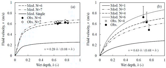 The observation and modeling of fluid velocities. (a) Φ1400 mm disks in the ML and IL (the running numbers N are 7 and 6 in the ML and IL, respectively); (b) Φ1800 mm disks in the OL—N varies from 3 to 6, and the error bar represents the standard deviation (n = 6). Rotating frequency ω is 60 rpm. Dots are observation data, lines are modeling results. Mod and Obs refer to modeling and observation, respectively. IL, ML, and OL are abbreviations of the inner, middle and outer lane, respectively.