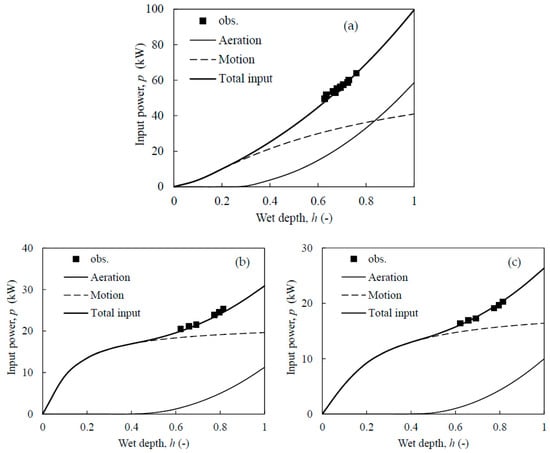 The dependence of input total power p on wet depth h in highest rotating frequency ω at 60 rpm. (a) Φ1800 mm aerators in the OL; (b) Φ1400 mm aerators in the ML; and (c) Φ1400 mm aerators in the IL. Obs is observed data. Solid and dash lines represent aeration energy and motion energy. Bold solid line represents total input power.