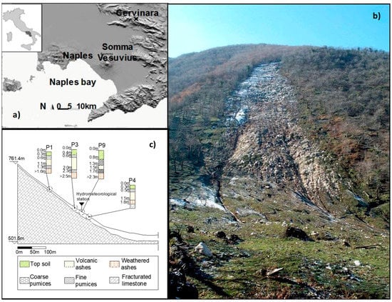 This study refers to the northeast slope of Mount Cornito, near the town of Cervinara, in Campania (southern Italy), which is located in the mountainous area about 40 km northeast of Naples (Figure 1). The slope was involved in a series of shallow landslides that occurred in an area of about 4 km2 during the night between 15–16 December 1999. The investigated area is part of the southern Apennines zone. The basal rock is Mesozoic–Cenozoic limestone, and the pyroclastic cover is mainly constituted by ashes (sand to loamy sand), with layers of pumiceous lapilli (sand with gravel). Near the interface with the bedrock, a layer of weathered ashes (silty sands) is present [18]. The slope ground surface has a regular inclination between 36° and 40° (Figure 1c). The deposit has the typical features found in the area, with the pumice layers only a few decimeters thick, while ashes reach a few meters. However, apart the foot of the slope, where accumulated colluvium reaches the depth of several meters of remolded material, the total thickness of the primary deposits rarely exceeds 2.5 m along the slope. Table 1 summarizes the main characteristics of the soils constituting the cover.