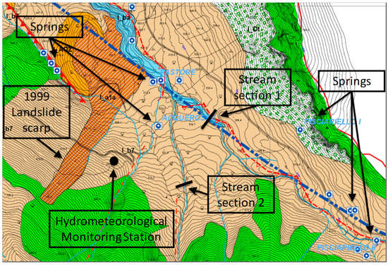 Since November 2017, new monitoring activities started. A hydrometeorological station was installed at the elevation of 585 m a.s.l., near the scarp of the landslide that occurred in December 1999 (Figure 2). It is equipped with a tipping bucket rain gauge with a sensitivity of 0.2 mm, a thermohygrometer, a pyranometer, an anemometer, and a thermocouple for soil temperature measurement. Six tensiometers (depths between −0.3 m and −3.2 m below the ground surface) and seven TDR probes (depths between −0.5 m and −2.5 m), which were connected to a Campbell Scientific TDR100 device, were also installed in an area of about 2 m2, in order to instrument a vertical alignment of the soil cover. All of the data were collected hourly. Aiming at collecting information that is useful for the assessment of the water balance of the area, the water level in two streams close to the monitoring station is also monitored (Figure 2). One of the monitored stream sections is located at the foot of the slope (Section 1, elevation 535 m a.s.l.), and is supplied by several semi-perennial springs, so that some small discharge is sometimes found also in summer. The other monitored stream (Section 2, elevation 570 m a.s.l.), in contrast, receives water only during the wet season.