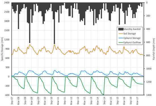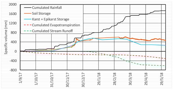 In Figure 4, the estimated trend of the specific storage of Equation (6) is reported. More specifically, as no information about the leakage from the epikarst toward the deep groundwater was available, the terms and could not be separated, and so only their sum could be estimated from the other measured/estimated terms of the balance equation. However, the spring discharge estimated from the stream water level was small, and it would further decrease during summer, when it usually becomes negligible. Hence, it can be argued that the epikarst storage was already very small at the end of the monitoring period, so that the estimated value of around 300 mm is mostly representative of deep groundwater recharge. Such a value is in reasonable agreement with the mean annual regional groundwater recharge estimated in the area [22].