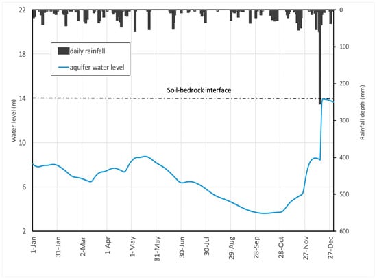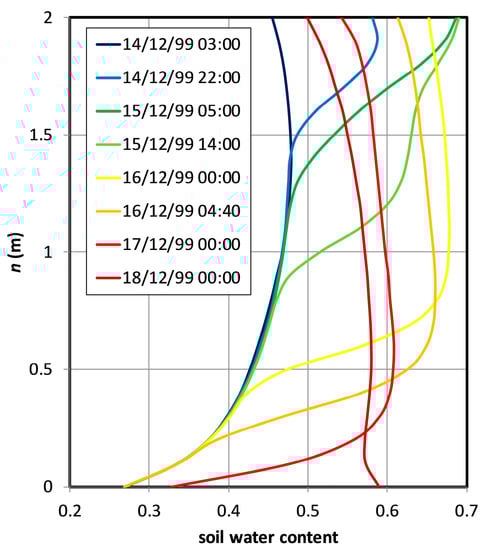 Figure 7 reports the volumetric water content profiles throughout the soil cover that were simulated at various times between 14–18 December. It appears clear how with the given initial conditions, the intense infiltration led to the establishment of a high soil moisture gradient at the base of the cover, so that most of the infiltrating water remained stored in the upper 1.5 m until the early morning of 16 December. This is due to the dry state of the soil at the base of the cover before the triggering event (i.e., , corresponding to ) caused by the relatively low water level in the perched aquifer. With the low unsaturated hydraulic conductivity of such a dry soil layer, only under large water potential gradient water could penetrate the base of the cover and cross the soil–bedrock interface. Through the soil water retention curve, large water potential gradients correspond to large soil moisture gradients. The simulated soil moisture profiles show that the maximum soil moisture gradient at the base of the cover developed on 16 December, between midnight and 5 am (which was the actual triggering time), leading to water content as high as 0.68 between 1.0–1.3 m below the ground surface. As said, the attainment of this value is related not only to the characteristics of the triggering rainfall event, but also to the initial soil moisture profile and to the water content at the soil–bedrock interface, which in turn depend on the water level in the epikarst aquifer. Both these latter features are the result of the predisposing hydrological phase.