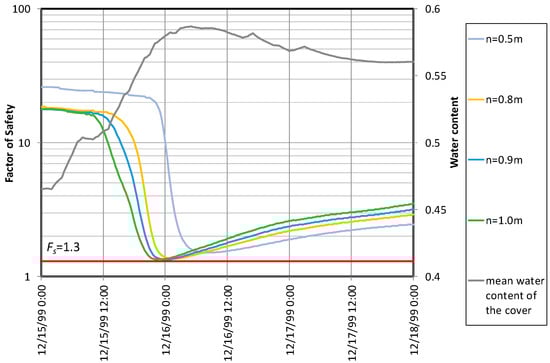 The effect of the infiltration features on the potential triggering of a landslide is shown in Figure 8, which reports the predicted evolution of the factor of safety at various depths, as well as the trend of the mean water content of the soil cover during the triggering event. The worst conditions for slope stability are predicted around midnight on 16 December, when was attained at depths between 1.0–1.5 m below the soil surface (respectively, and ). Such depth is consistent with the reported depth of the failure surface, which was well above the interface with the bedrock [47]. Although the predicted minimum value of would not imply slope failure, it is small enough to be considered indicative of potential instability. In fact, heterogeneities play a big role in the triggering of landslides, which cannot be completely captured by the simplified modeling approach adopted here. The real slope presents variable inclination, soil cover thickness, and hydraulic and geotechnical soil properties. Furthermore, the considered cover, which is here schematized for simplicity as homogeneous, is actually characterized by soil layers with different properties (Table 1). The presence of layers with low hydraulic conductivity may exacerbate the mechanism suggested by the modeling results, enhancing the moisture gradient required for the infiltrating water to reach the soil–bedrock interface. This would lead to higher water content within the soil profile, and consequently to a smaller factor of safety. Indeed, it has been recently shown that in the pyroclastic covers of Campania, either coarse layers (i.e., pumices) in dry conditions, or fine layers (i.e., weathered ashes) in wet conditions may hinder the infiltration process [8]. Although the detailed description of the infiltration process falls beyond the aim of this simplified approach, the model results shed some light on the concurrence of long-term predisposing processes and short triggering mechanisms for landslide initiation.
