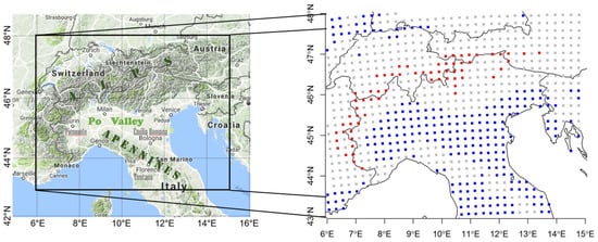 Figure 1 shows the computational domain, which occupies most of the Alpine region and Northern Italy, including the Po River basin, bordered by 5 E–15 E and 43 N–48 N. In this domain, a total of 720 grid points are defined which are categorized into three different areas depending on the grid elevation (h) above sea level (a.s.l.): the plain area (blue; h≤ 500 m a.s.l.), the normal-mountain area (grey; 500 m a.s.l. <h≤ 2000 m a.s.l.), and the high-mountain area (red; h> 2000 m a.s.l.).
