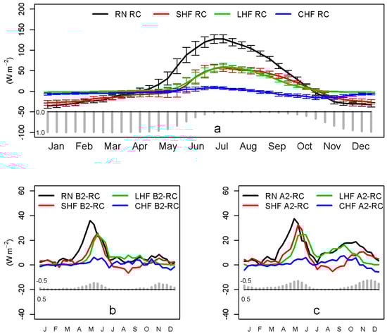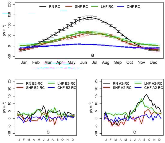 Figure 2b,c show the difference fields between the RC and FCs. LHF tends to exceed SHF in FCs, with the largest LHF increments observed in FC between July and October (Figure 2c). The peak of LHF shifted from the beginning of June in the RC to July in both FC and FC, whereas the peak of SHF was always at the end of June in phase with that of NR (not shown). This is caused by the noticeable increment in LHF, especially in summer, which masks the smaller increment in the SHF.