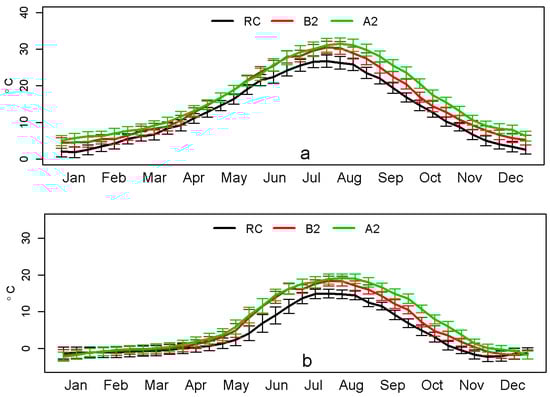 Annual cycles of the 10-day average soil temperatures (in C) in the upper soil layer (5 cm deep) in the RC (black), FC (red) and FC (green) at (a) plains and (b) high mountains. The standard deviations are also plotted (vertical bars).